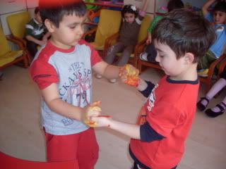 Sarı ve kırmızıya boyalı eller ile iyice tokalaştık.Bakalım ne olacak?